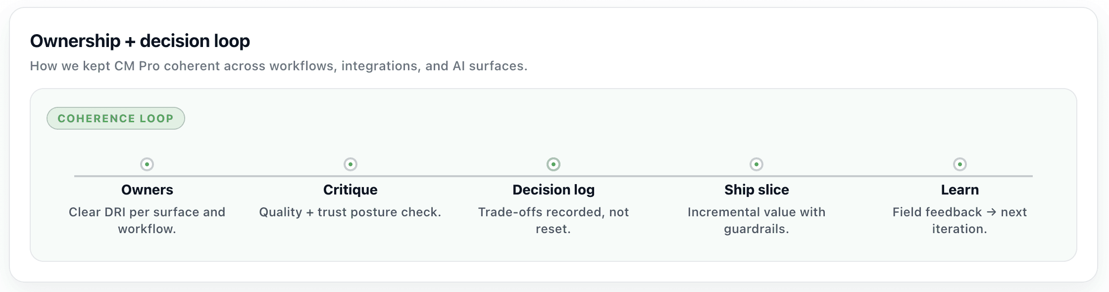 My job was to keep the system coherent. I used the thesis as the decision filter, forced trade-offs into the open, and protected the trust gates even when speed was tempting, because in contracting, the cost of being wrong is higher than the cost of being slower.