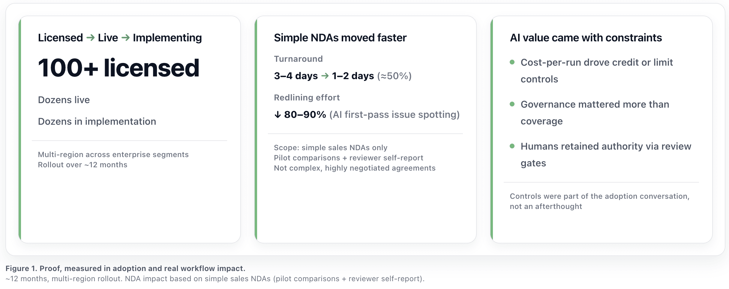 Outcomes: In ~12 months: ~120 licensed, ~35+ live, ~55 implementing (multi-region). For simple NDAs: turnaround dropped ~50% (3–4 days → 1–2) and redlining effort dropped ~80–90% with AI-assisted review. A regulated enterprise win validated the thesis: adoption follows trust, rollout realism, and workflow-native packaging.