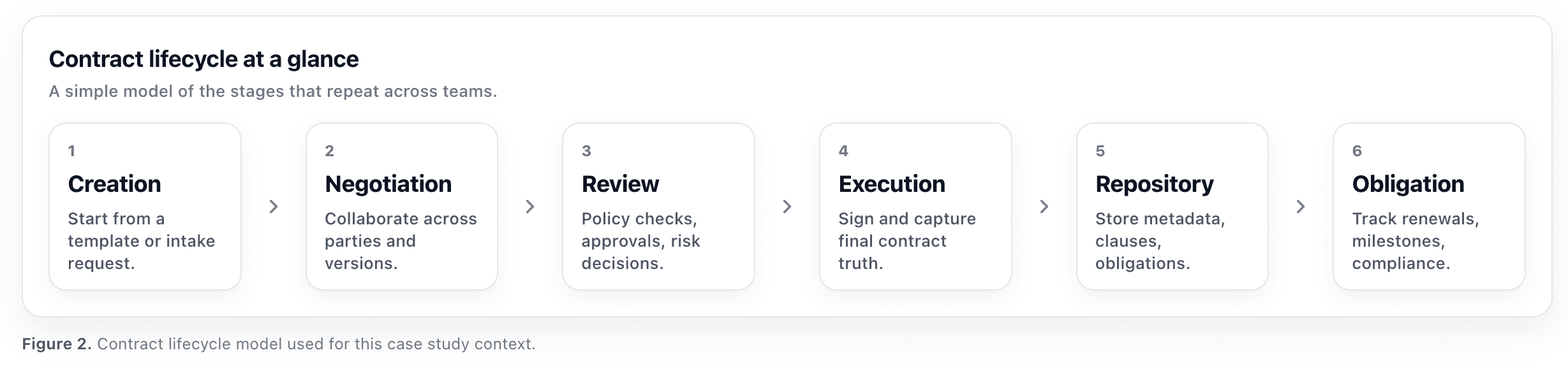 After signing, contracts become operational truth: metadata, renewals, and obligations that drive downstream work. The lifecycle is: request → author/review → sign → repository → manage obligations.